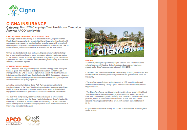 Company Name: APCO Worldwide Campaign Name: CIGNA Insurance Awards won: Bronze Winner for Best Healthcare Campaign Continue reading➦