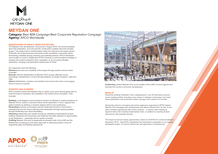 Company Name: APCO Worldwide Campaign Name: Meydan One Awards won: Bronze Winner for Best Business to Business Campaign Continue reading➦