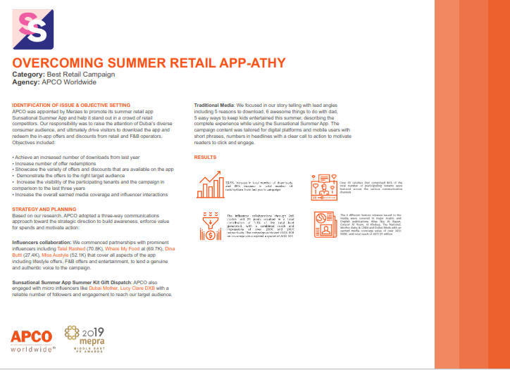 Company Name: APCO Worldwide Campaign Name: Overcoming Summer retail app-athy Awards won: Silver Winner for Best Retail Campaign Continue reading➦