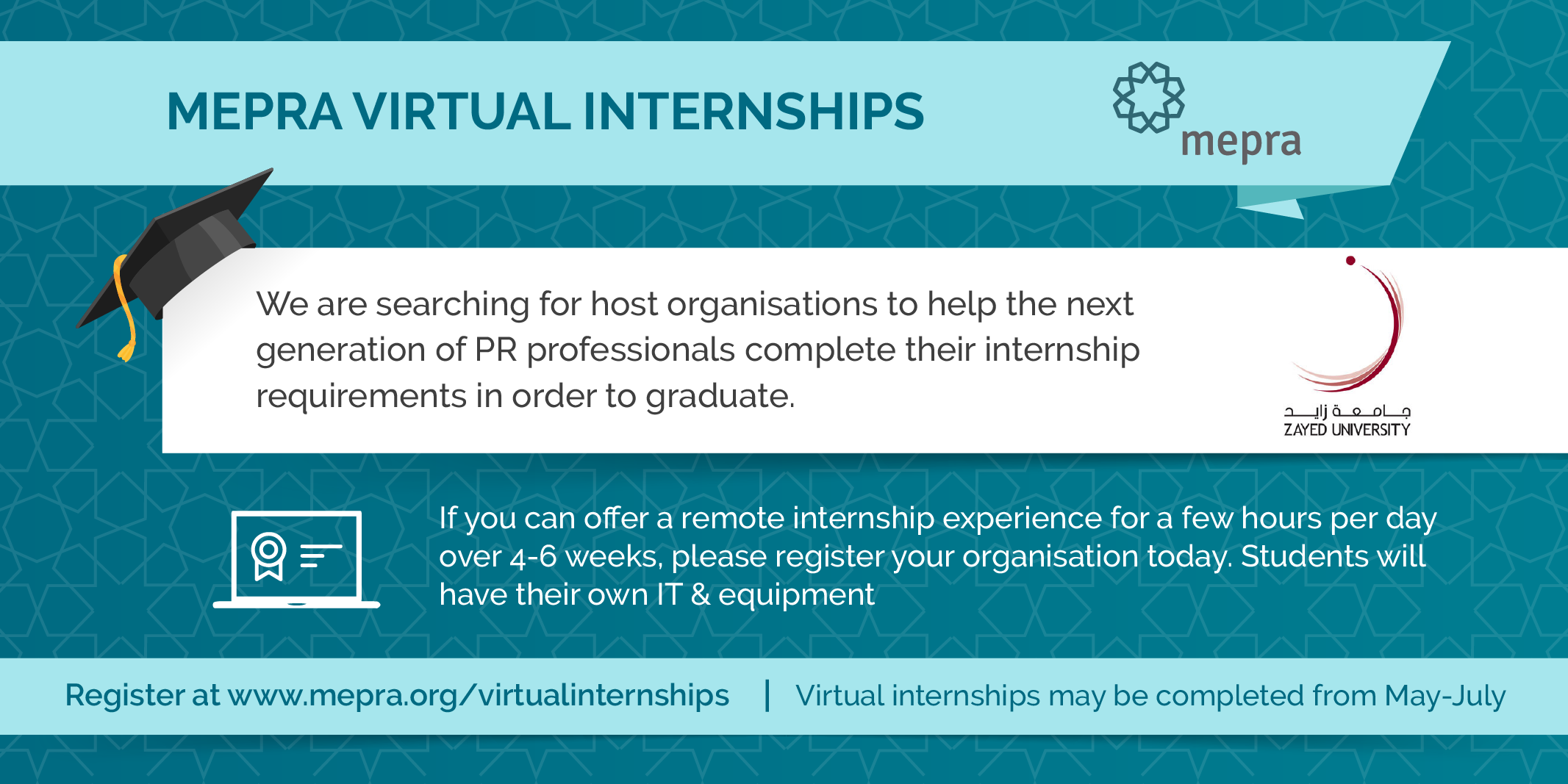 in order to graduate. MEPRA is working with Zayed University to found host organisations who are able to offer virtual internships for 4-6 weeks so