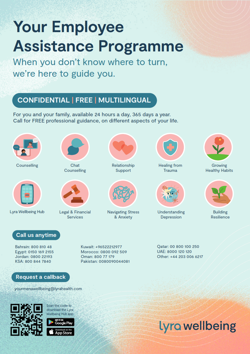 Balancing the demands of work and life isn’t always easy. Whether you’re feeling anxious about work or dealing with a personal matter at home, we know that one area of our lives will often affect the other. In light of this, we are pleased to announce the launch of our new Employee Assistance Programme (EAP) through Lyra Wellbeing. It is a holistic program that will give you access to professional psychologists, financial and legal consultants. We are eager to support our members and their family members. The EAP provides a confidential personal support and information service that members and their families can call to help them deal with everyday situations and more serious concerns.