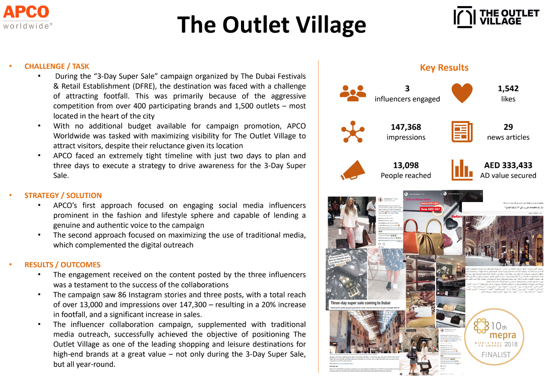 Company Name : APCO Worldwide Campaign Name: The Outlet Village_ 3 Day Super Sale MEPRA Awards 2018 title: MEPRA Awards 2018 Finalist for Best Integrated Campaign Continue reading➦
