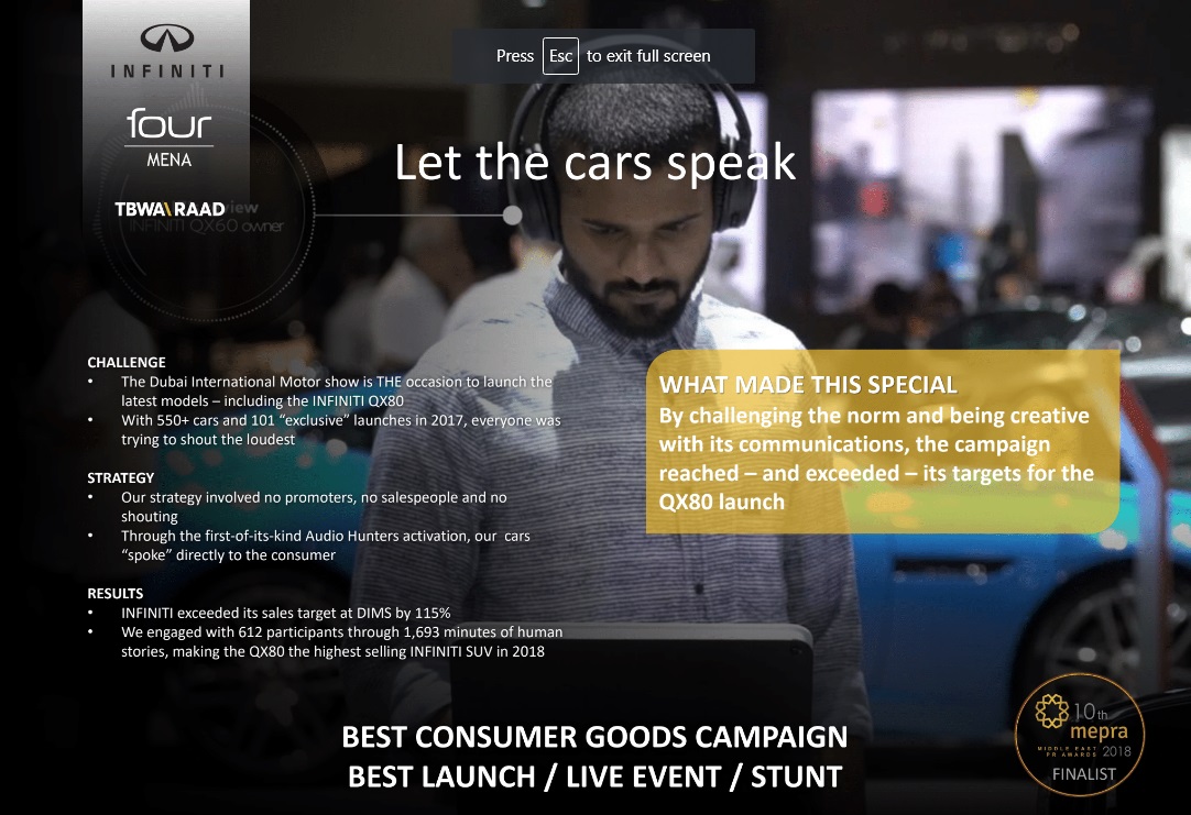 Company Name : INFINITI Middle East with TBWA/ Raad and Four Communications Group Campaign Name: “Let the cars speak” MEPRA Awards 2018 title: MEPRA Awards 2018 Gold Winner for Best Launch/Live Event/ Stunt MEPRA Awards 2018 Finalist for Best Consumer Goods Campaign View the full Awards submission here. Continue reading➦