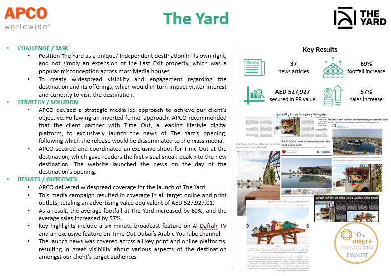 Company Name : APCO Worldwide Campaign Name: The Yard Launch- Meraas Destinations MEPRA Awards 2018 winning title: Finalist for Best Use of Traditional Media Relations Continue reading➦